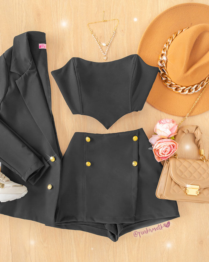Este set negro de tres piezas es una combinación perfecta para lucir elegante. El blazer, el crop top y la falda short te permiten crear looks infinitos. El estilo, la calidad y la comodidad de esta prenda harán que tengas una apariencia impecable para cualquier ocasión. ¡Combina tu estilo con la elegancia de este Set negro!