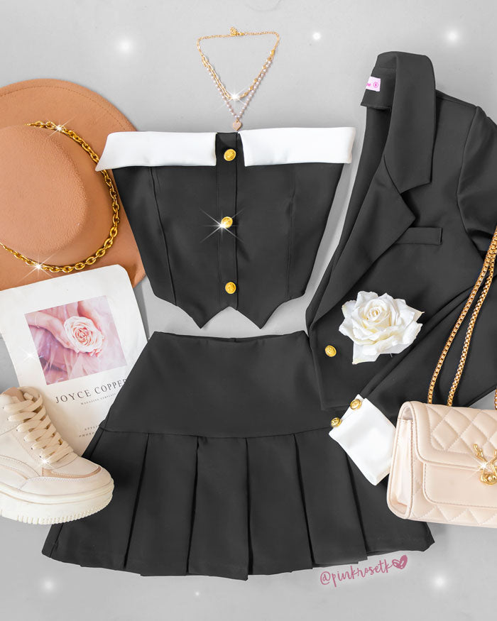¡Haz una declaración de moda con este impresionante set negro! Incluye una falda short, un top y un blazer, todo adornado con un toque de blanco. Ideal para un look elegante y moderno. ¡Atrévete a destacar con este set que te hará sentir confiada y poderosa!