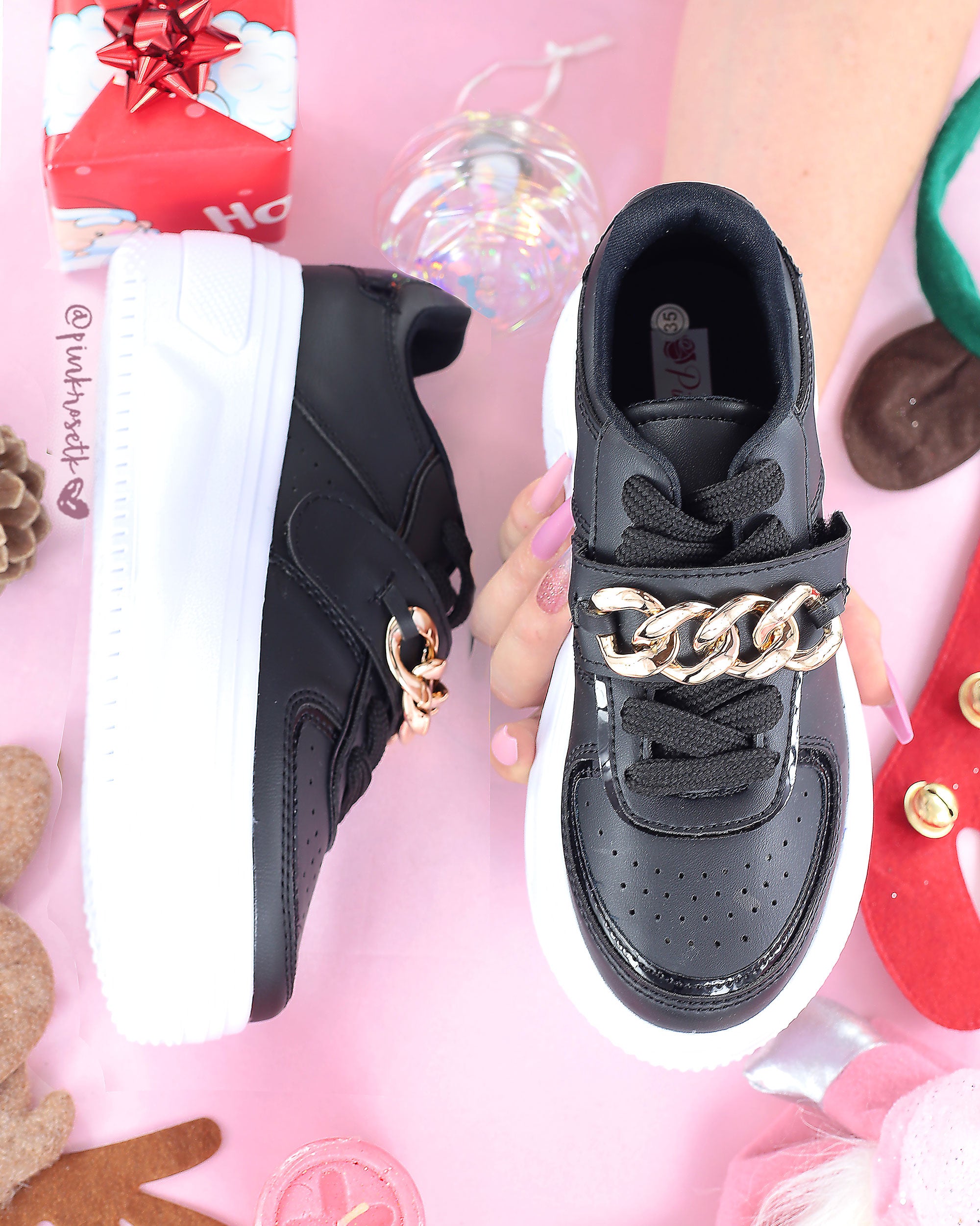 ¡Luce elegante y a la moda con estos tenis negros con cadena dorada en el cordón! Destácate en cualquier ocasión con este detalle único y atractivo. Hechos con materiales de alta calidad y diseños de última tendencia, ¡estos tenis te harán sentir cómodo y seguro mientras te destacas del resto!