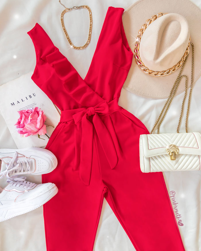 Enterizo rojo rubí escote en v con volante