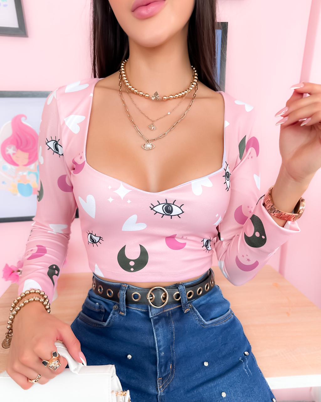 Disfruta esta hermosa blusa, con cuello cuadrado y detalles en luna y ojos, de estilo moderno y elegante para combinar con tu look diario. Su tono rosado le añade un toque alegre y juvenil a tu look.