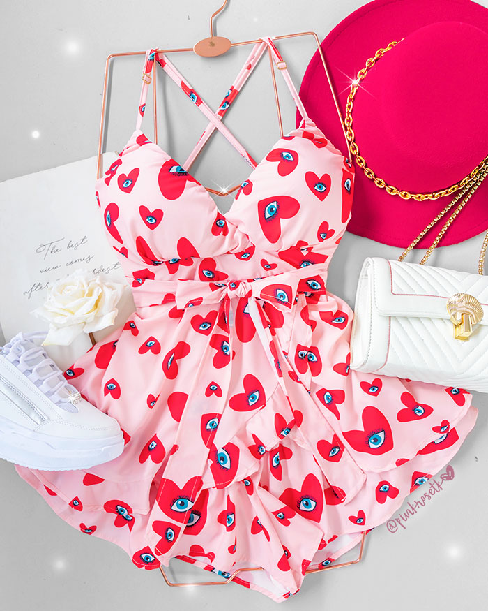 Este romper rosado de copas y tiras estampado con ojos es perfecto para la temporada de verano. Con sus copas para el sujetador y tiras de seguridad, es cómodo de llevar y seguro al mismo tiempo. El divertido patrón de ojos añade un toque divertido a cualquier look.
