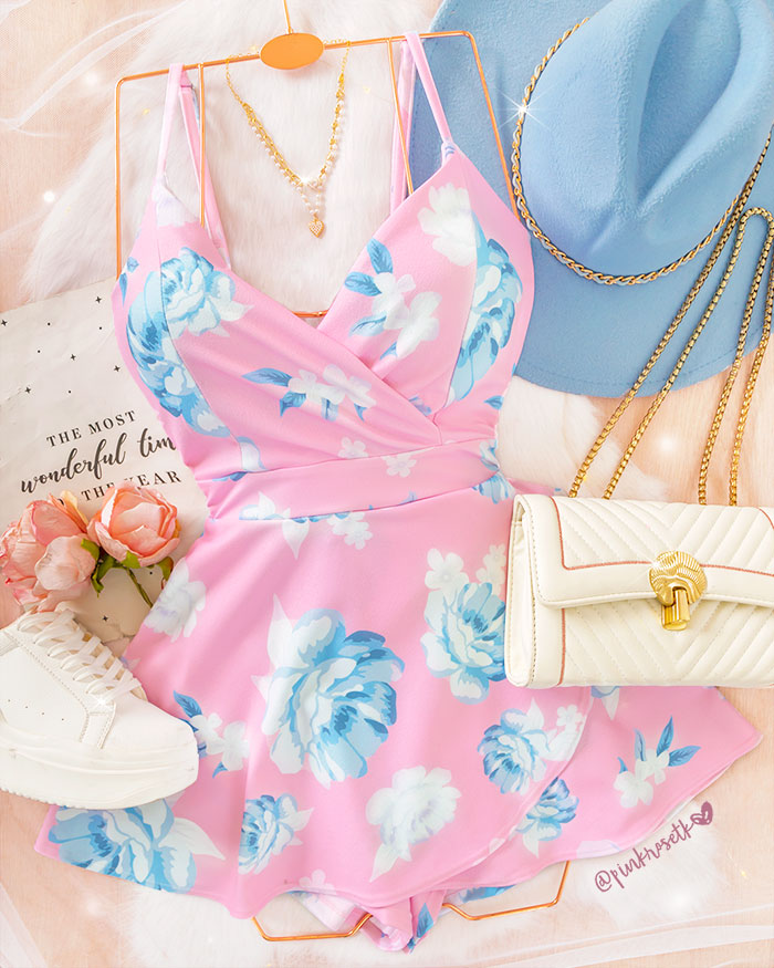 Romper rosado de tiras con estampado de flores azules y blancas
