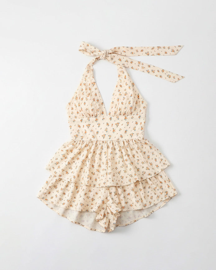 Este romper está confeccionado en falso chaliz, un material ligero y fresco que ofrece una caída suave y cómoda, ideal para climas cálidos. Su estampado floral aporta un estilo femenino y alegre, perfecto para looks casuales con un toque romántico.