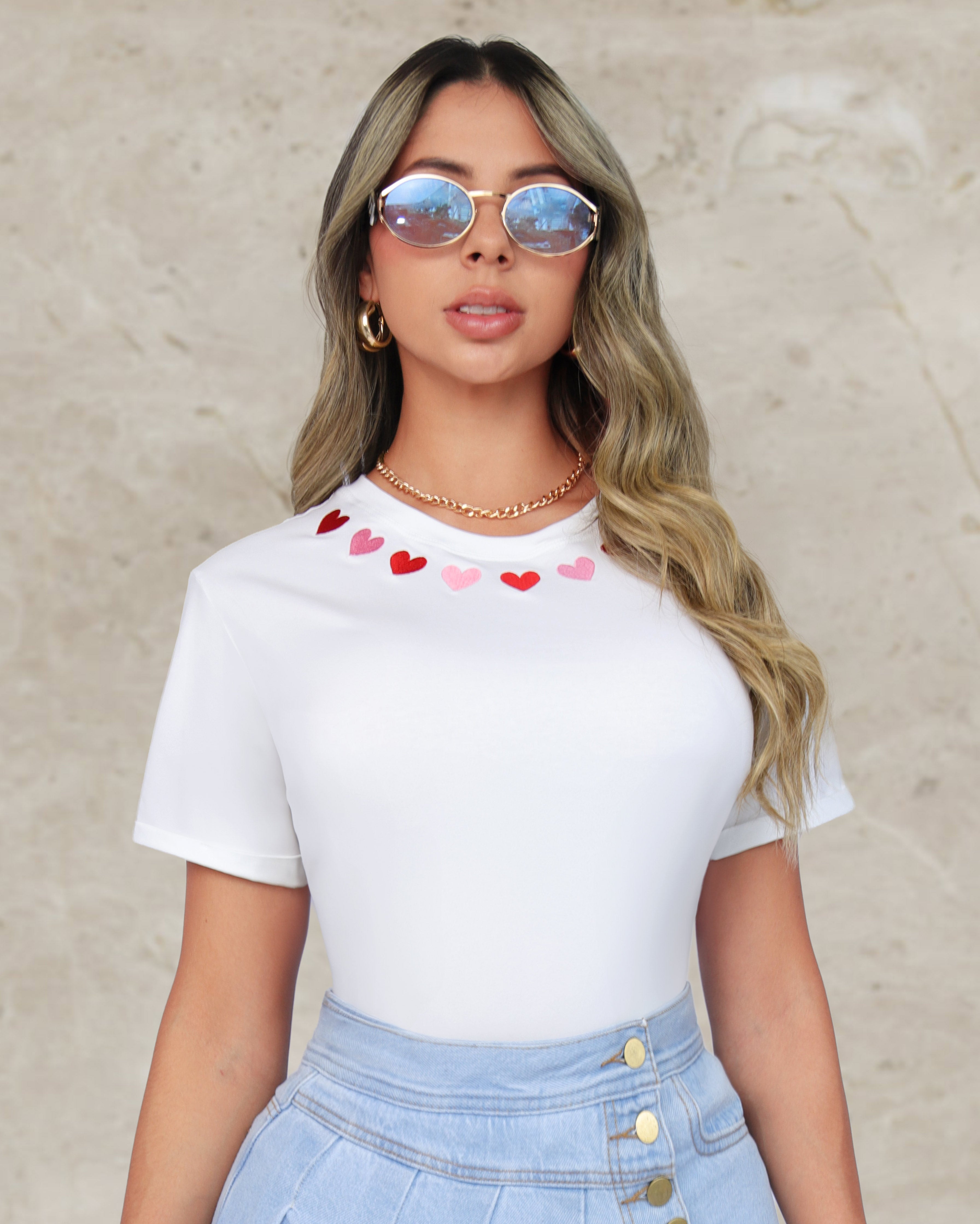 Enamórate del detalle y la comodidad con nuestra camiseta de corazones bordados, una prenda que combina ternura, estilo y suavidad. Su diseño delicado con pequeños corazones bordados añade un toque romántico y femenino, ideal para quienes aman los looks casuales con encanto.