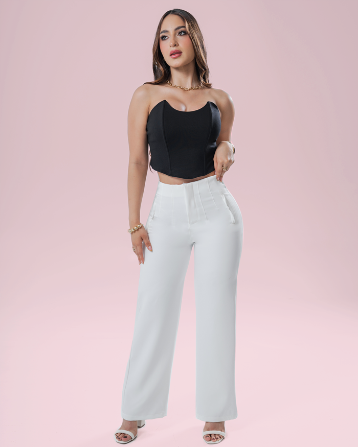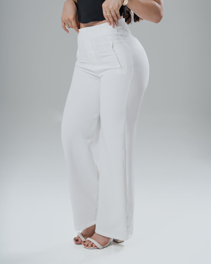 Su corte de pierna ancha añade movimiento y un toque moderno, ideal para looks formales, de oficina o eventos especiales. El color blanco lo convierte en una prenda versátil y atemporal que combina con blusas, tops o bodys para lograr outfits frescos y pulidos.