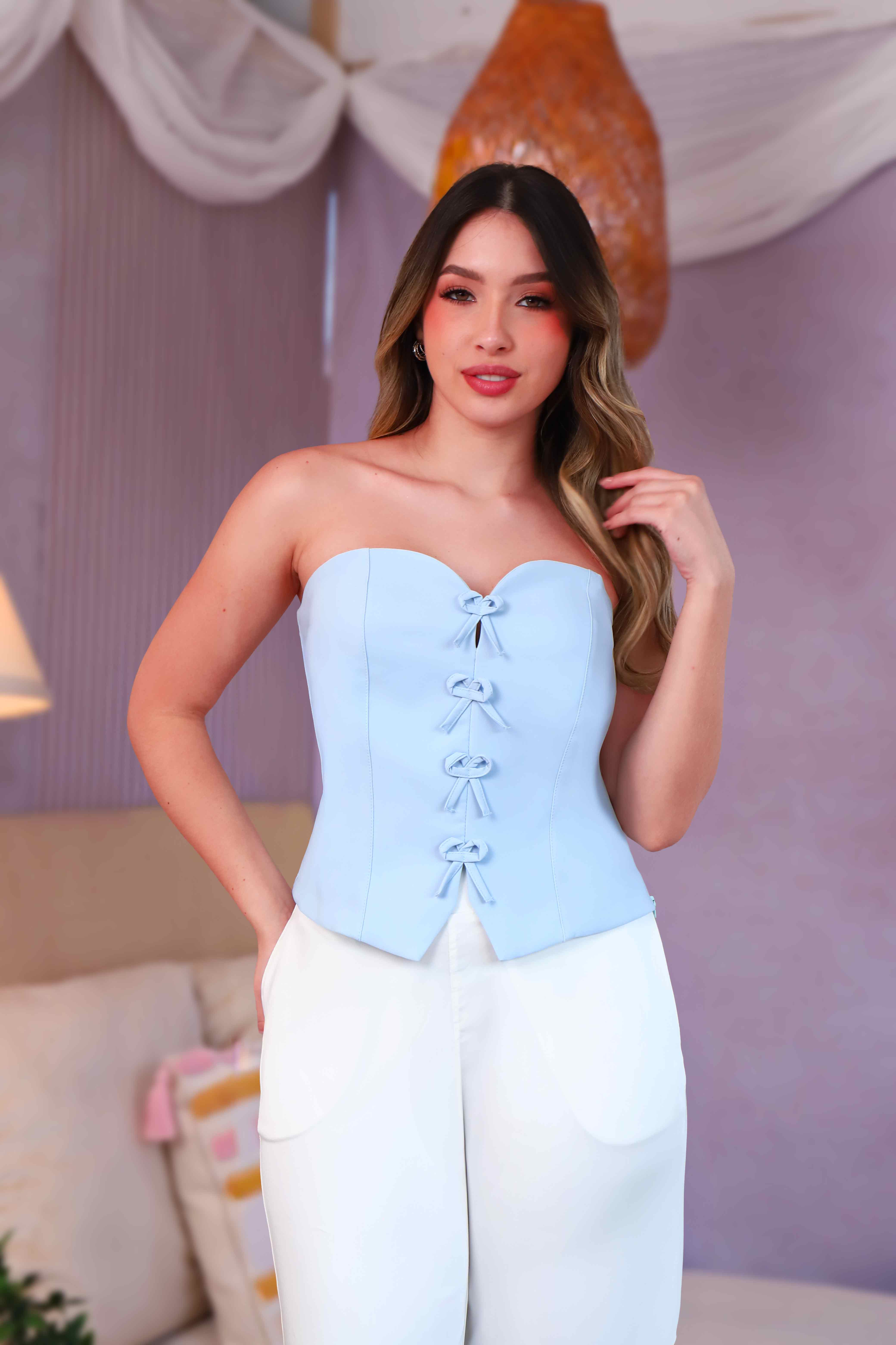 Su diseño strapless realza los hombros y el escote, mientras que los cuatro moños decorativos en la parte frontal añaden un detalle único lleno de encanto, convirtiéndolo en una pieza llamativa y perfecta para ocasiones especiales o salidas donde quieras brillar.