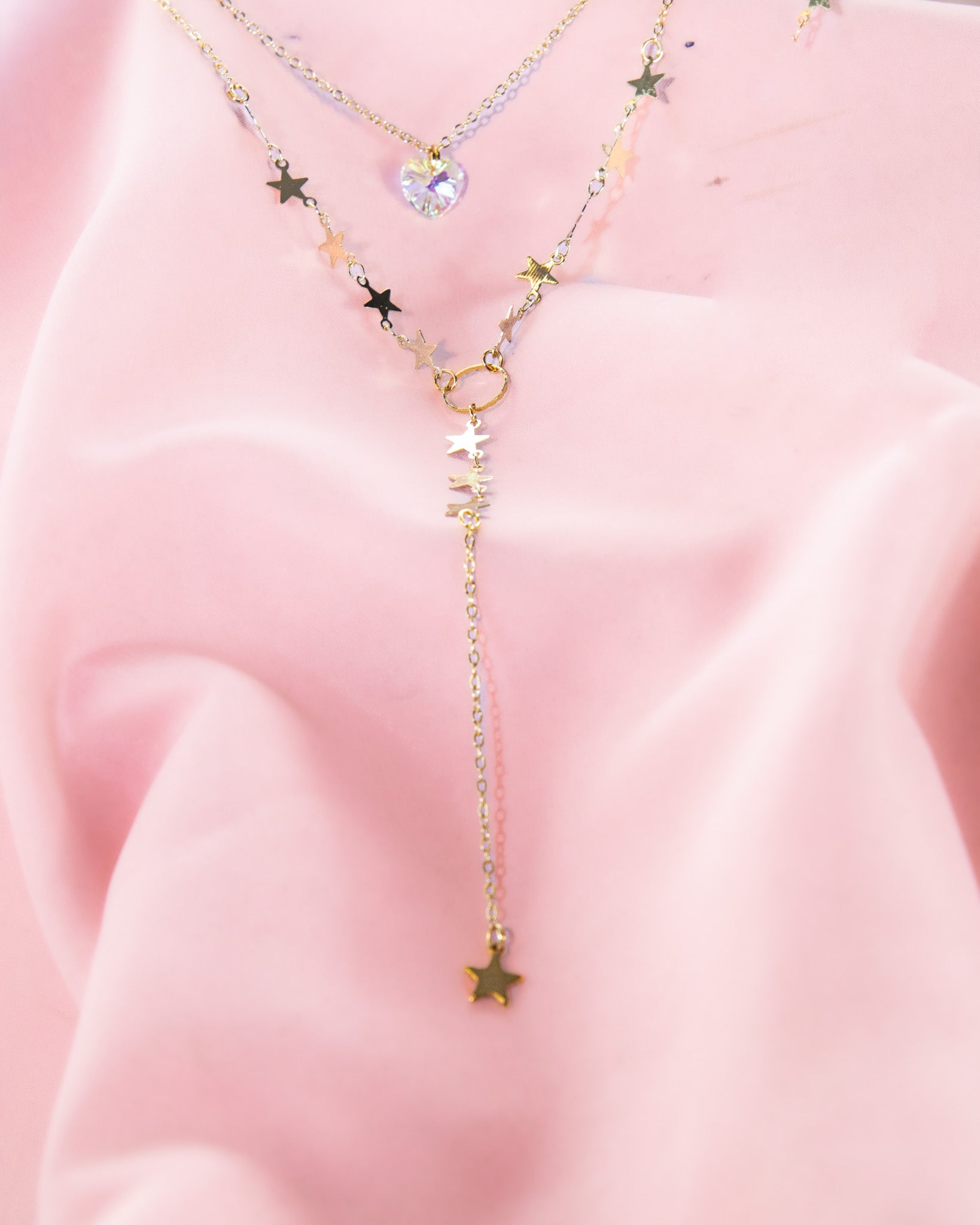 La segunda capa incorpora una composición de estrellas metálicas intercaladas que conducen hacia un aro central del cual cae una cadena vertical estilo lariat, finalizando en una estrella colgante que estiliza visualmente el escote y añade movimiento al conjunto.