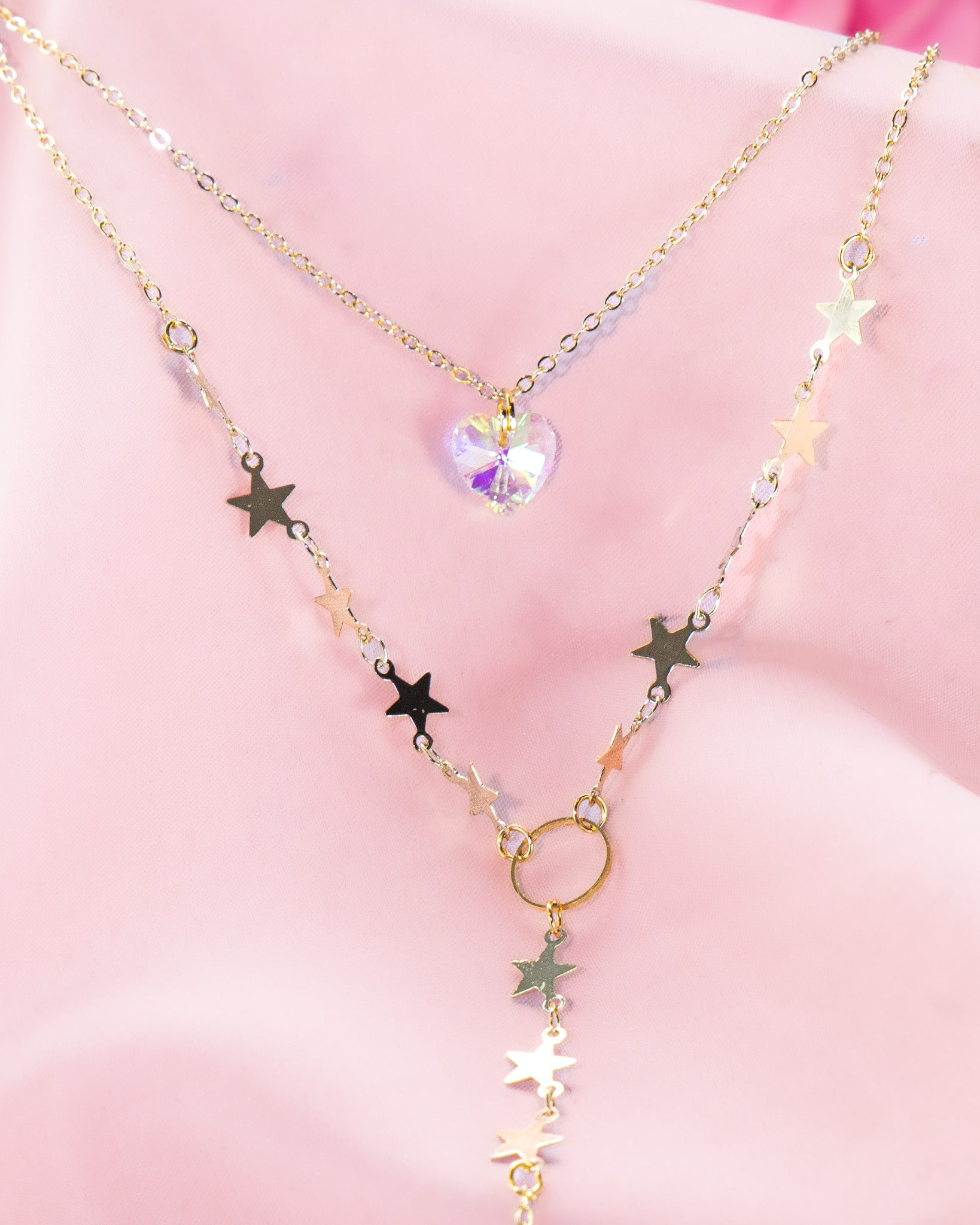 La primera capa presenta una cadena fina adornada con pequeñas estrellas distribuidas a lo largo del diseño, creando un efecto sutil y encantador. En el centro destaca un delicado dije en forma de corazón con acabado cristalino y facetado, que refleja la luz con destellos iridiscentes, aportando un toque romántico y sofisticado.