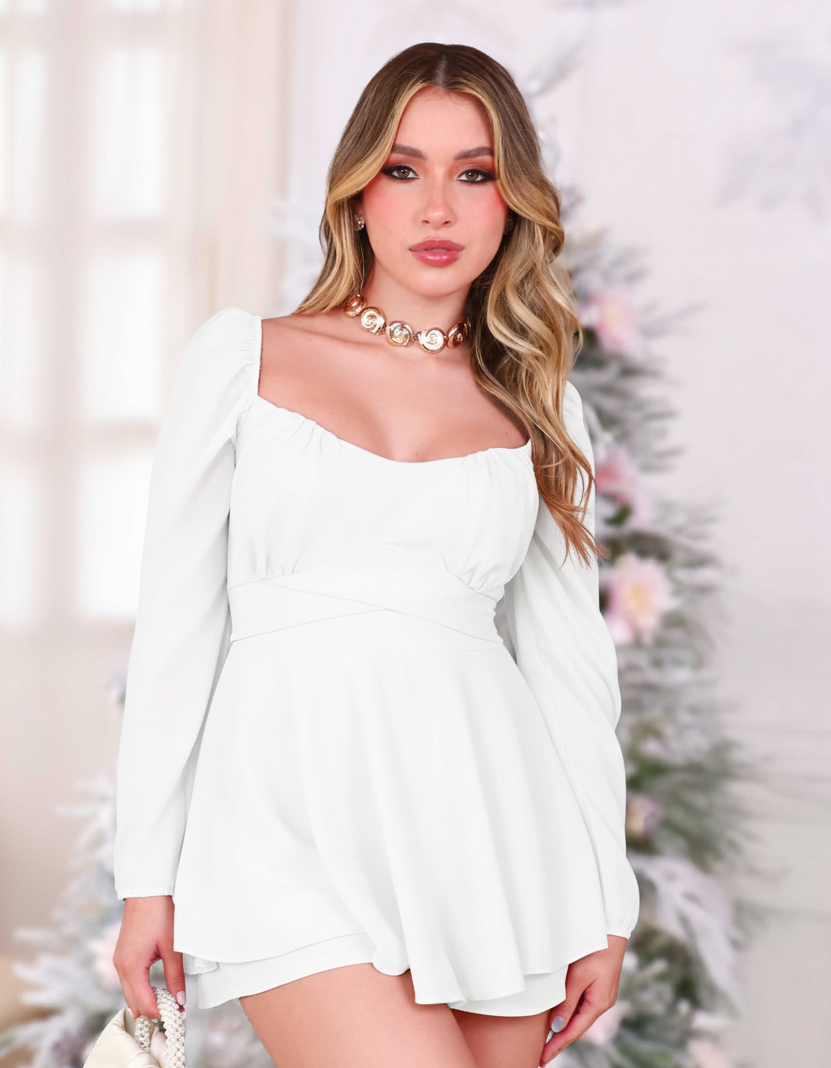 Romper de manga larga con escote cuadrado está confeccionado en material Falso Chaliz, reconocido por su ligereza, suavidad y caída fluida que realza la silueta sin perder frescura.