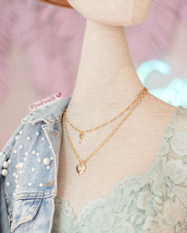 Hoy te traemos esta linda cadena dorada, con dos dijes uno de corazón y el otro una llave, ideal para combinar tus outfits mas románticos, seguro este accesorio le dará mucha vida a tus looks.