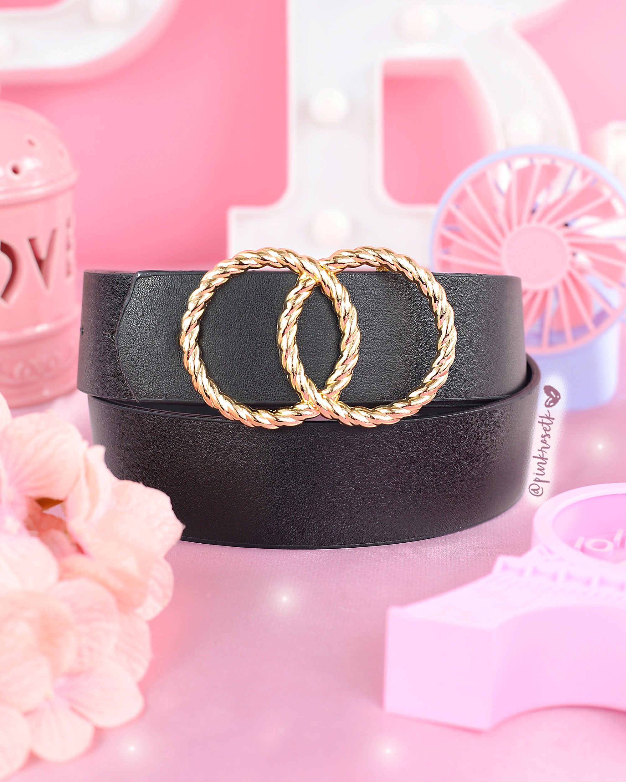 Este cinturón negro con herraje dorado de doble círculo trenzado es una pieza única y atemporal. Su estilo clásico y elegante lo convierte en el complemento perfecto para cualquier conjunto, ya sea casual o formal. Añade un toque de sofisticación y estilo a tu armario con este cinturón imprescindible.