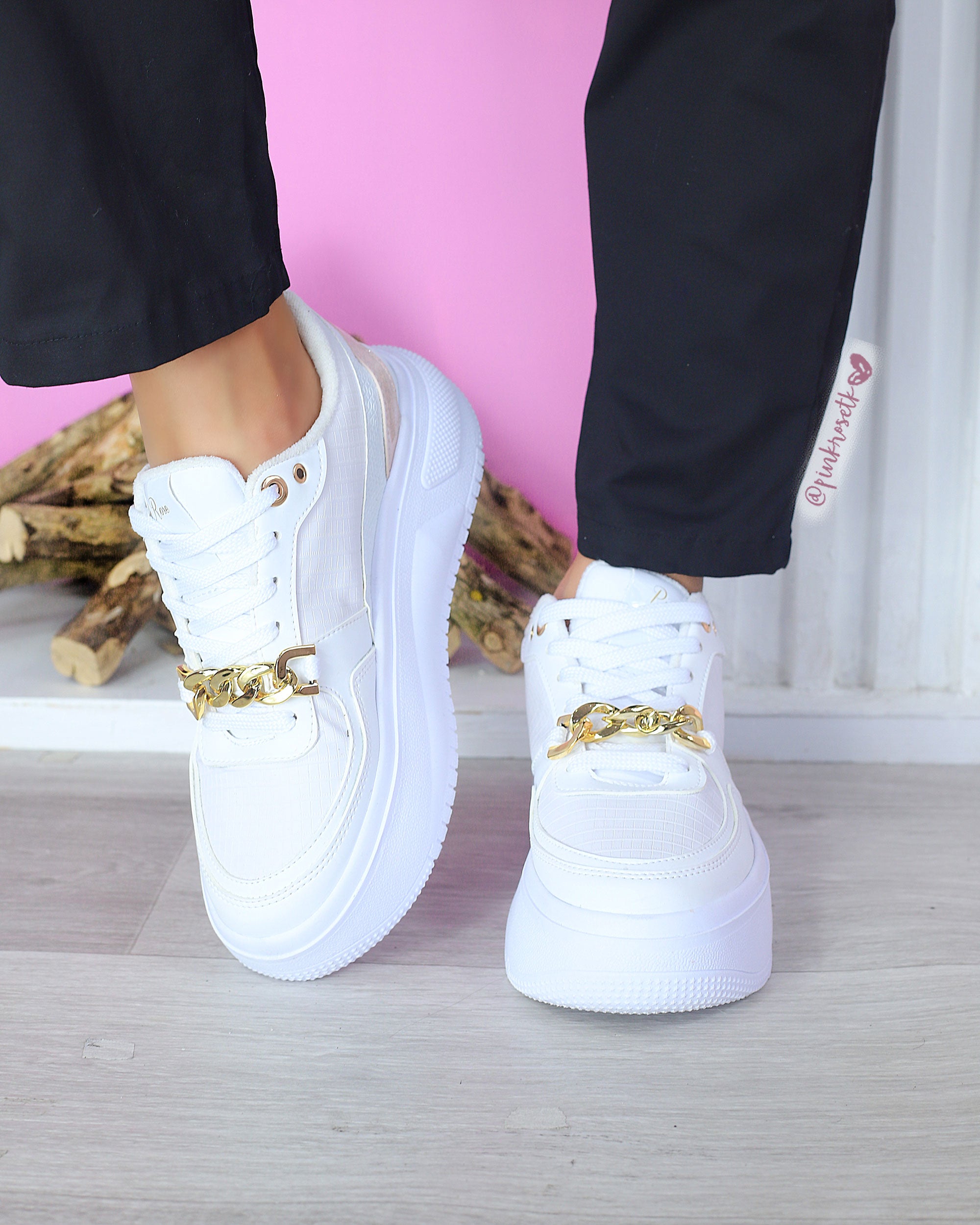 Tenis blancos con cadena y detalle rosa