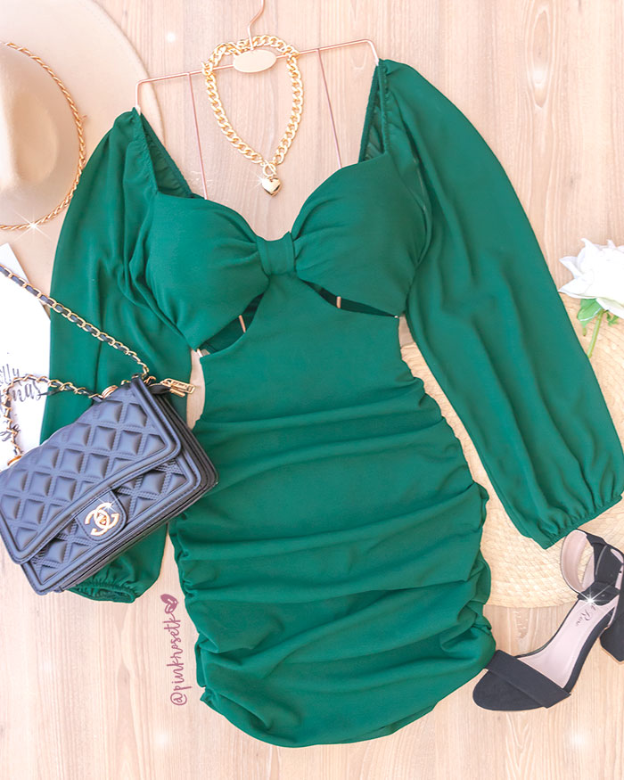 Este estilo de vestido es precioso y trae mangas en velo y trae aberturas debajo del escote, ahora disponible en color verde.