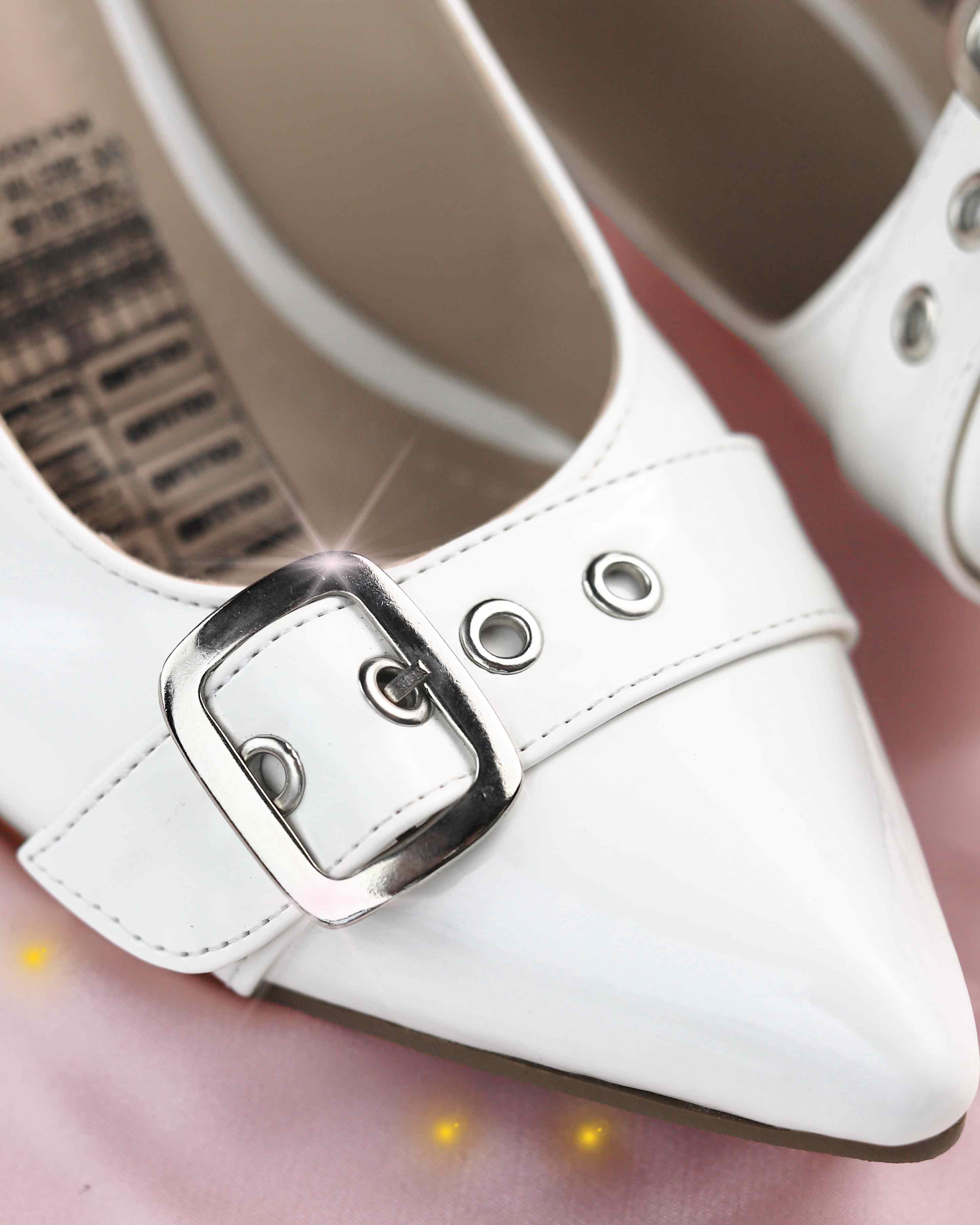 Su diseño presenta una punta fina estilizada, ideal para alargar visualmente la silueta del pie y aportar un toque sofisticado. La característica principal de este modelo es su correa frontal con hebilla metálica, un detalle decorativo que añade personalidad y un estilo moderno al diseño. Los ojales metálicos complementan el look y crean un contraste sutil que lo hace más llamativo y único.