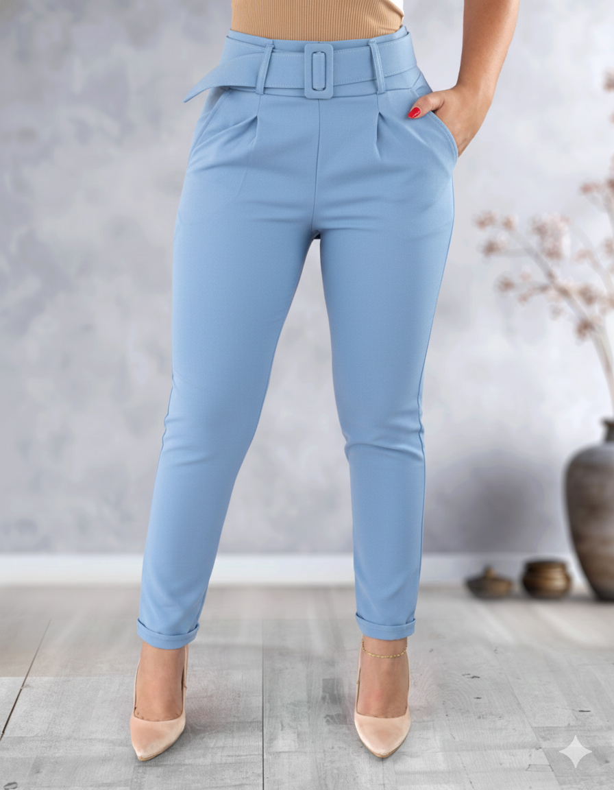 Pantalón Noches de Viena con hebilla forrada, una prenda sofisticada que combina comodidad y diseño refinado. Su corte favorecedor realza la silueta, mientras que la hebilla forrada aporta un detalle distintivo que eleva cualquier outfit, perfecto para ocasiones formales o casuales con toque chic.