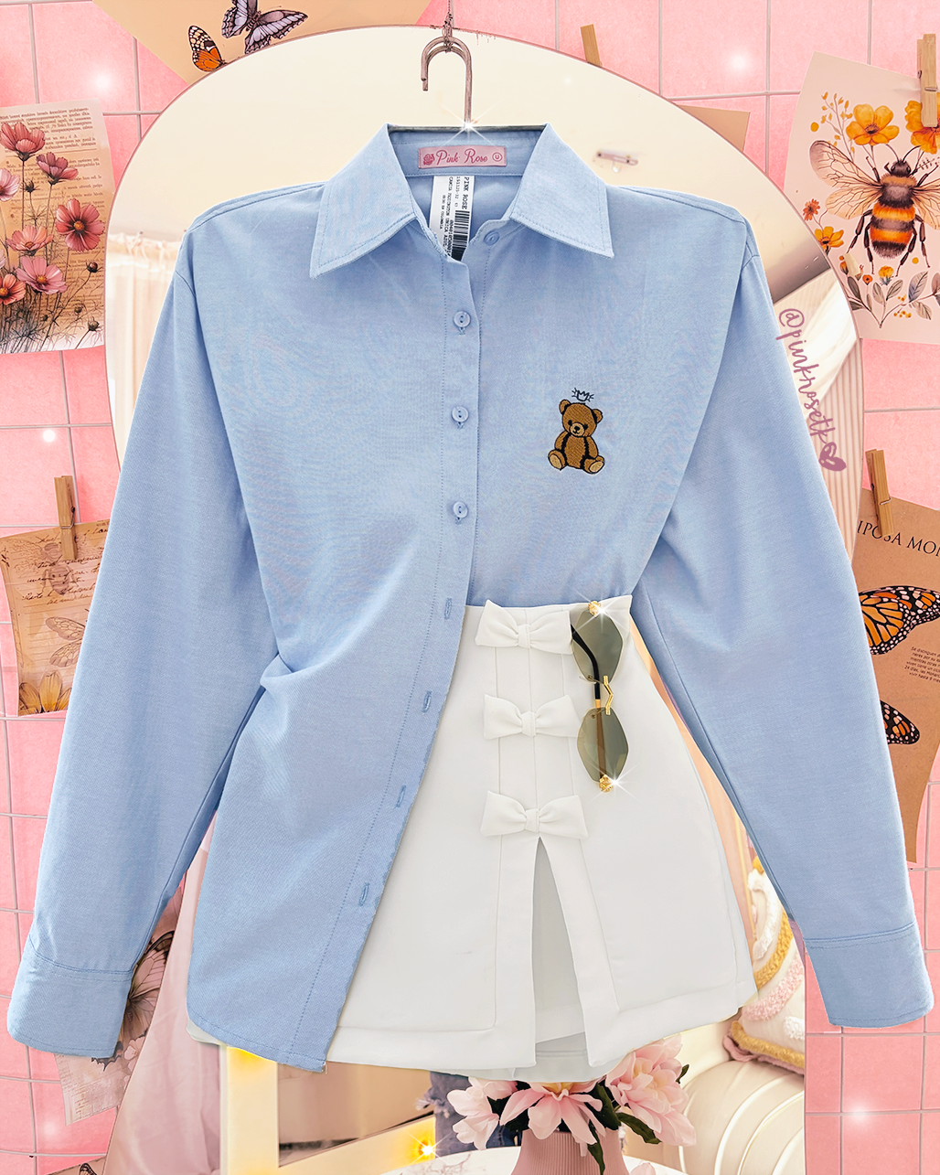 El oso bordado al lado aporta un detalle distintivo y original que realza el diseño, añadiendo personalidad y un aire juvenil a la prenda. Su corte clásico y mangas largas la convierten en una opción versátil, perfecta para combinar con jeans, pantalones o faldas, tanto en looks casuales como semi formales.