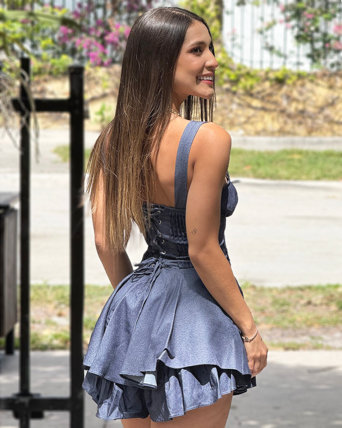 Romper con un diseño moderno y estructurado, resaltado por sus tiras gruesas que aportan soporte y estilo. La espalda tipo corset permite un ajuste favorecedor, realzando la silueta con un toque sofisticado. Confeccionado en un tejido cómodo y ligero.