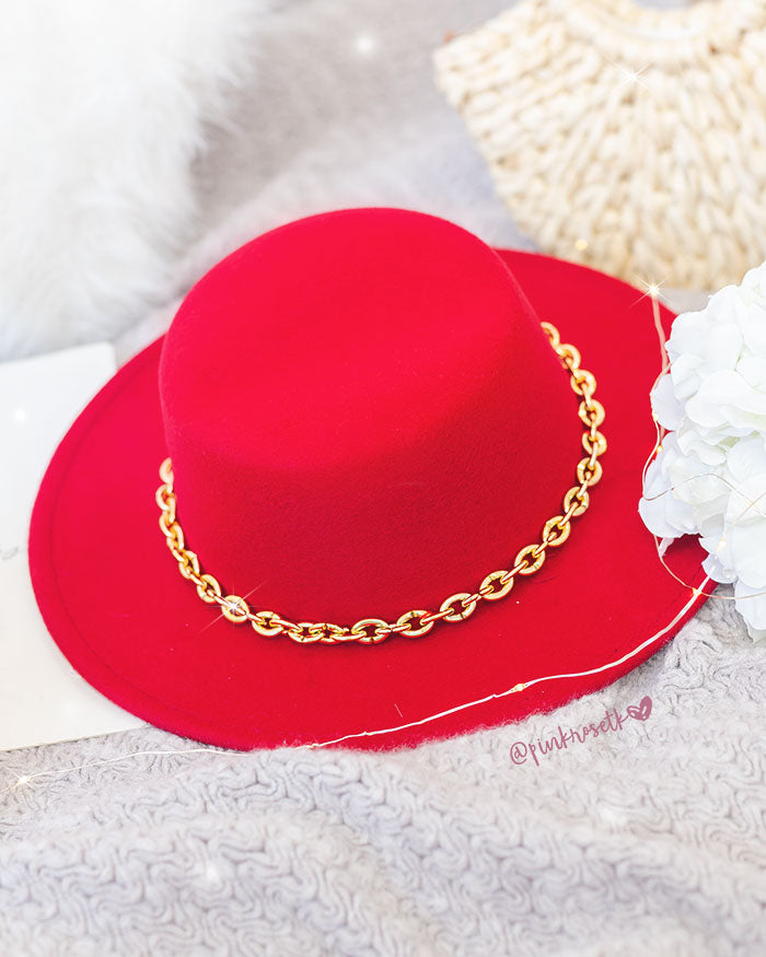 SOMBRERO ROJO DE CADENA DORADA
